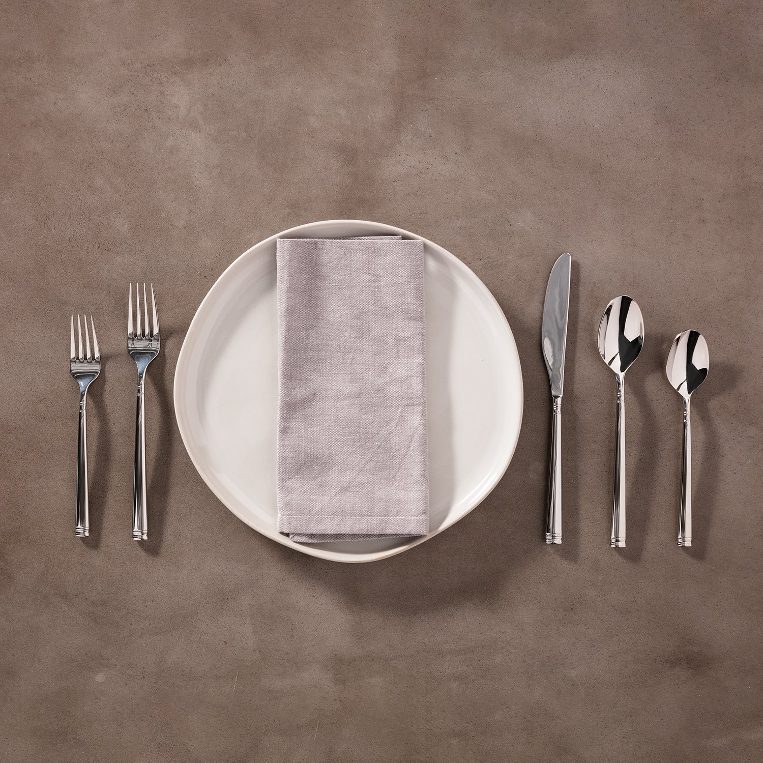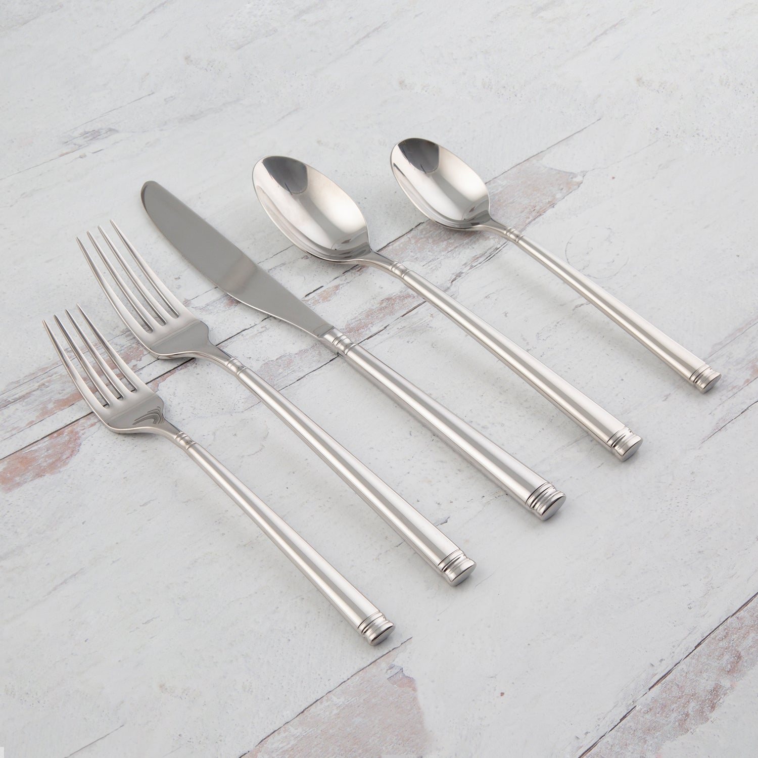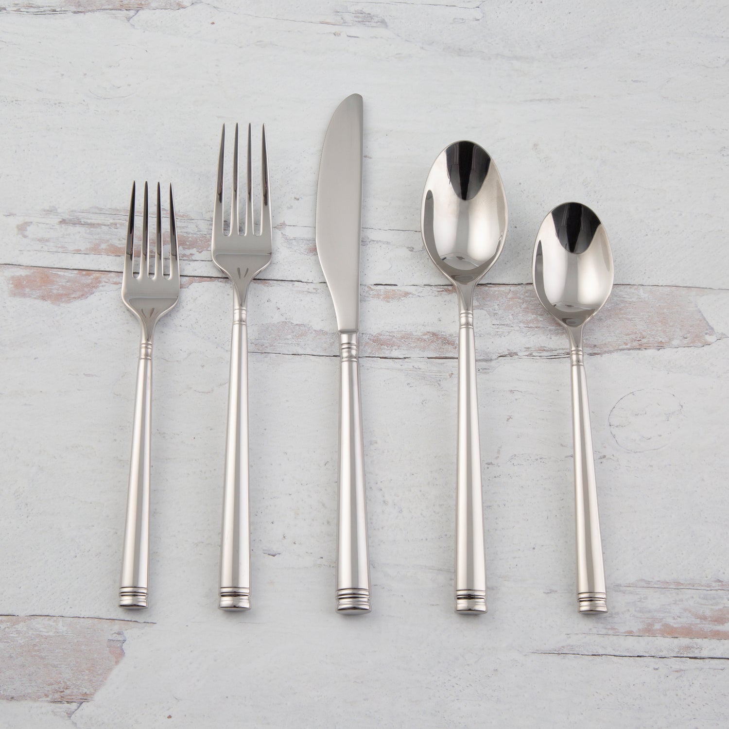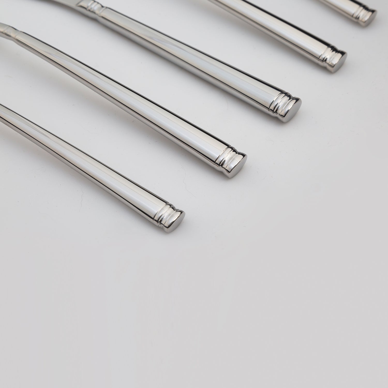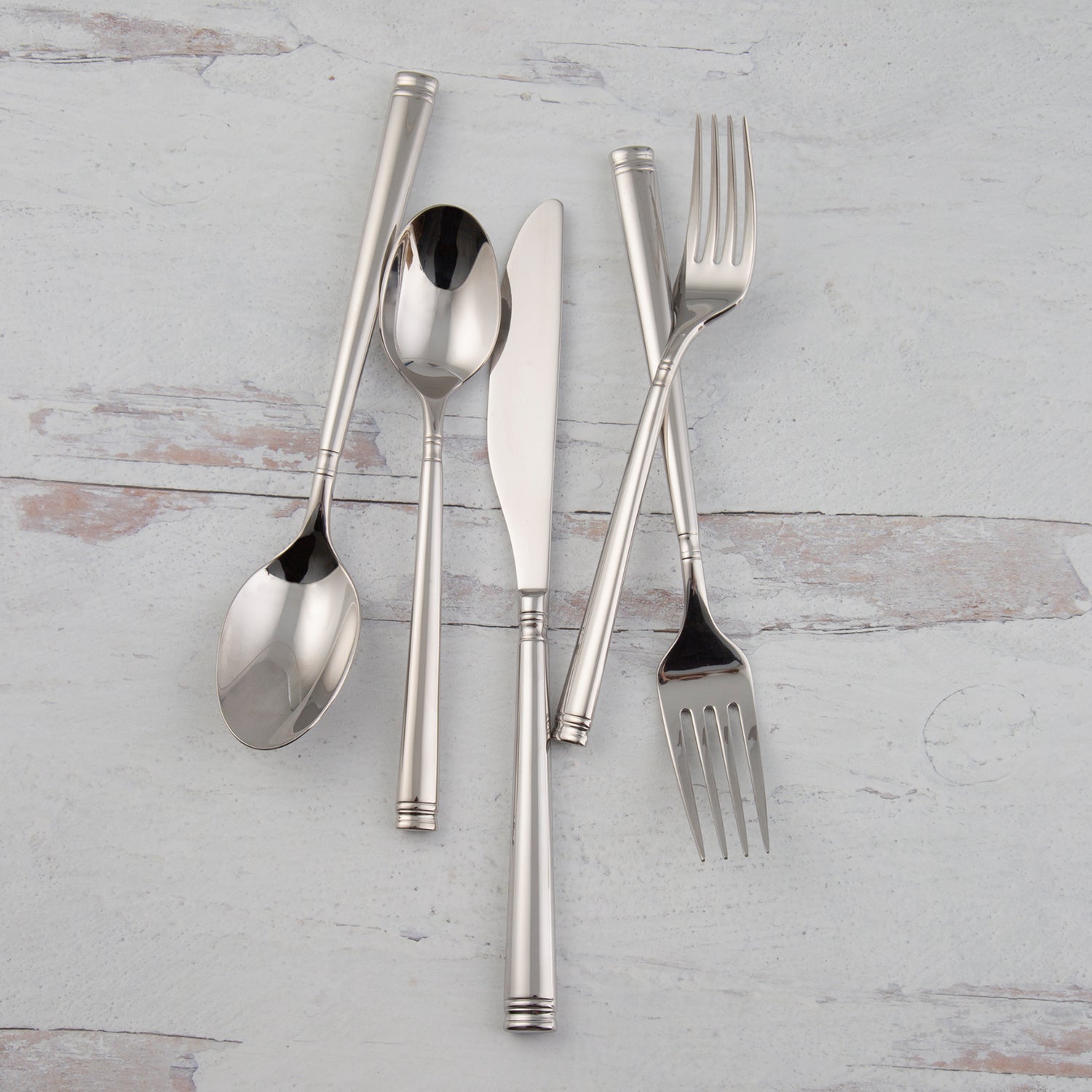 Service de 20 pièces pour 4 personnes, forgé en acier inoxydable 18/10 de la plus haute qualité. Le motif présente un motif traditionnel de barre au niveau du col et de l'extrémité des anses, avec une finition polie et élégante.