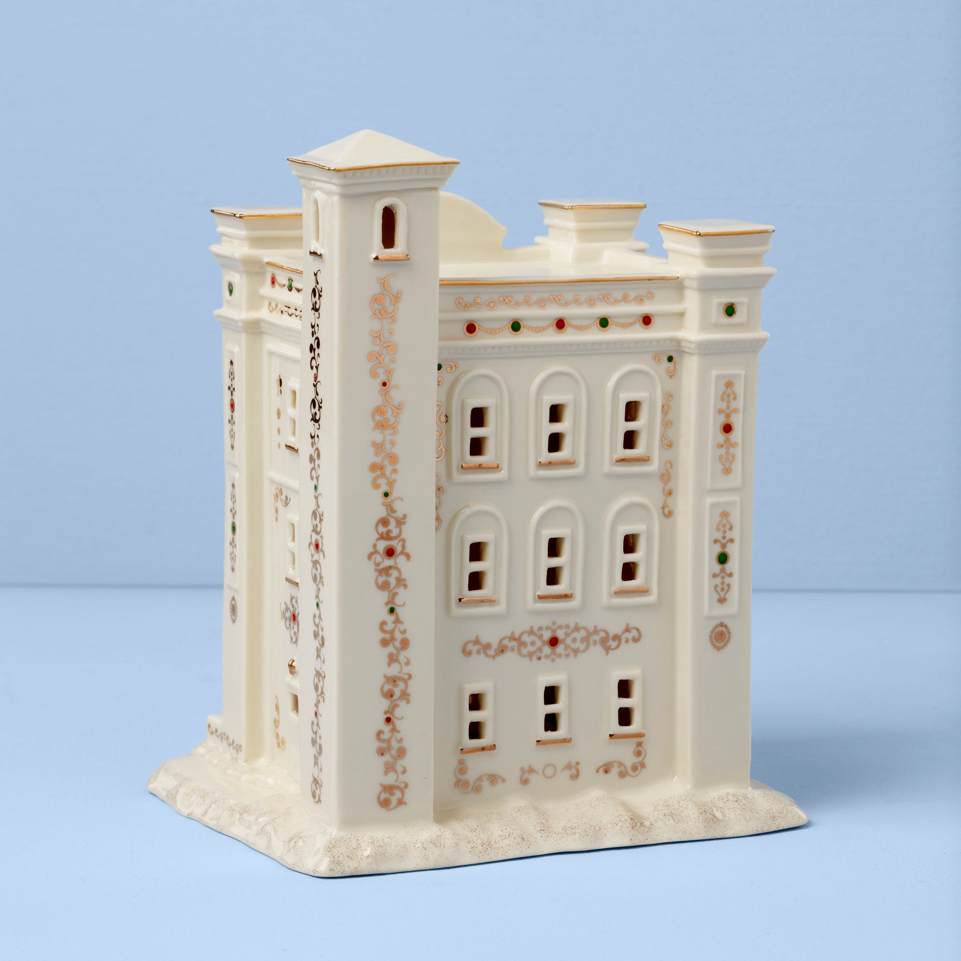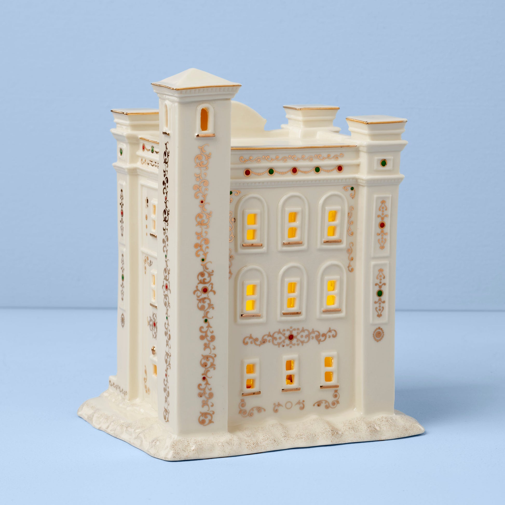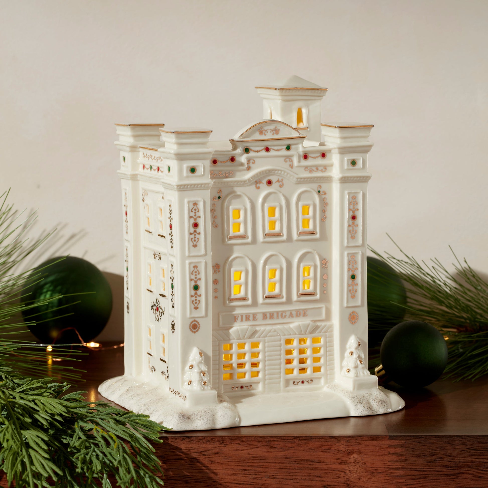 Cette figurine lumineuse représentant une caserne de pompiers est fabriquée en porcelaine crème et s'illumine doucement de l'intérieur pour créer une atmosphère chaleureuse. Décorée à la main avec des touches d'or 24 carats pour une finition éclatante, elle ajoutera une touche de charme à votre collection Mistletoe Park Village Traditions ou à toute décoration de cheminée de Noël !